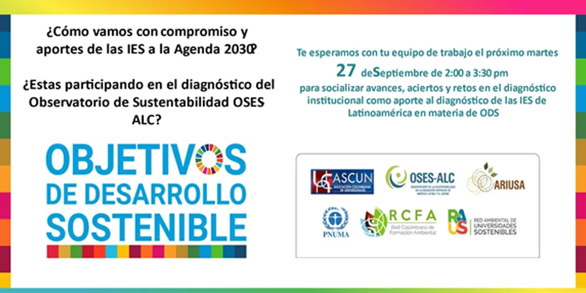 El 27 de septiembre de 2022 se realizó una reunión de acompañamiento a las Universidades colombianas, sobre el diligenciamiento del “Formulario para el diagnóstico del conocimiento, compromiso y aportes de las instituciones de educación superior de Latinoamérica a la Agenda 2030”. Este evento fue convocado por la Asociación Colombiana de Universidades (ASCUN) y el Observatorio de la Sustentabilidad en la Educación Superior de América Latina y el Caribe (OSES-ALC).
